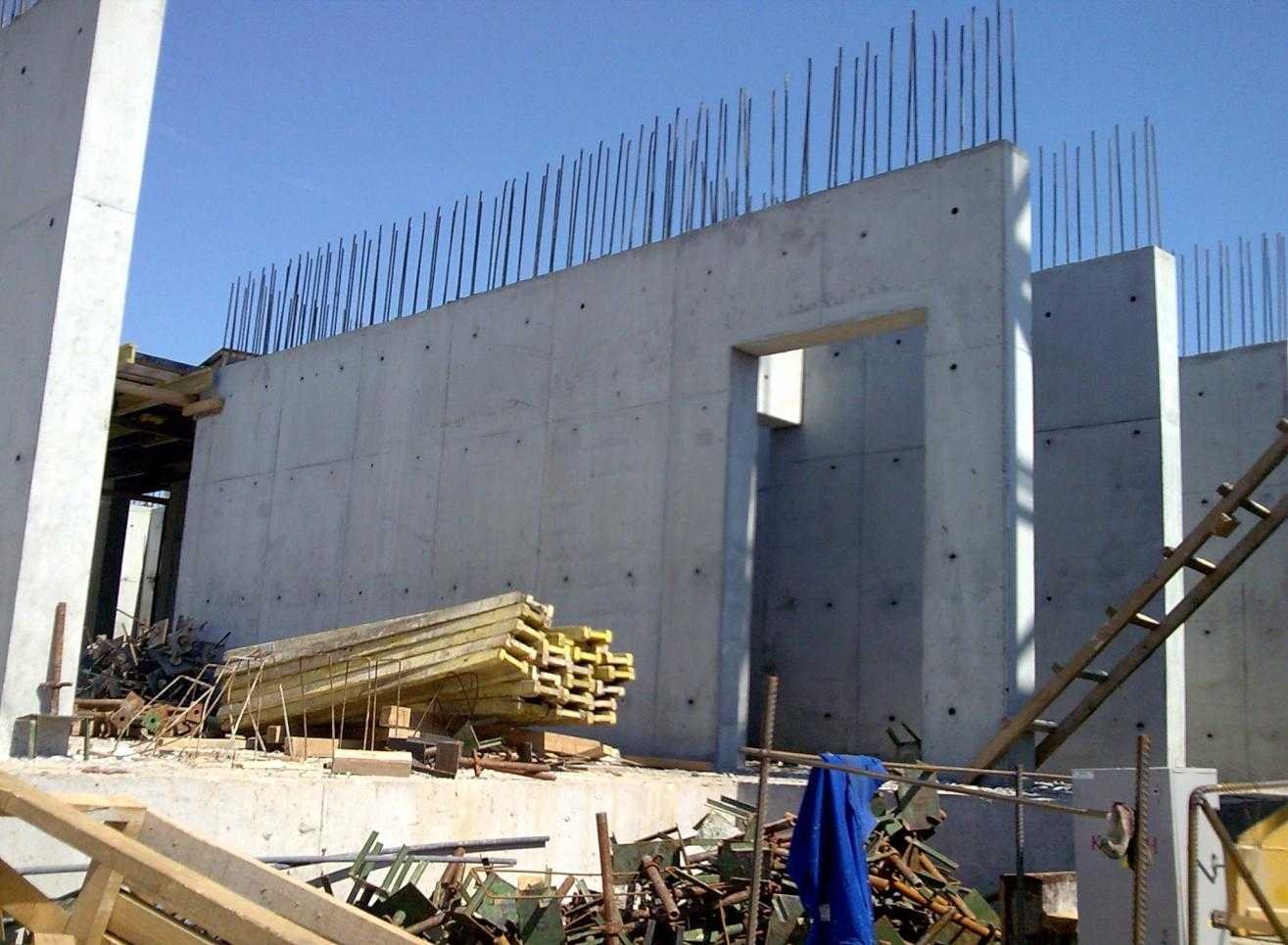 Опалубка для стін готується із дощок або металевих листів. Збирається за допомогою систем кріплення, при цьому конструкція повинна містити внутрішні і зовнішні розпірки. Після встановлення армування здійснюється подача готового бетону під стіни. Кожен новий обсяг під час заливання укладається на попередній свіжий.