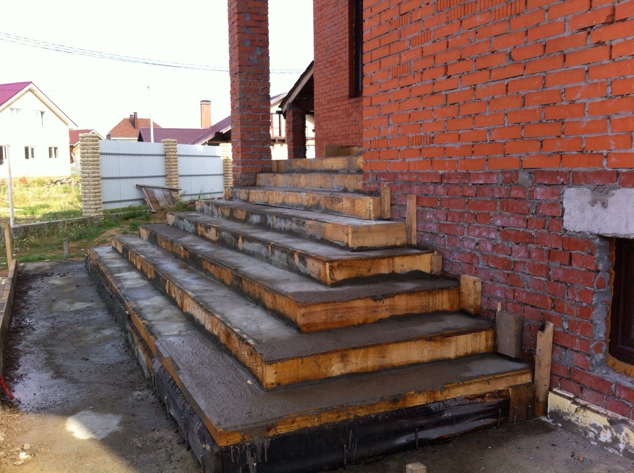 Сам процес заливання бетонної основи фактично ідентичний роботі з будівництва тераси. Спочатку готується територія, укладається піщана подушка, робиться опалубка. Також необхідно здійснювати армування для посилення конструкції. При бетонуванні використовується розчин із цементу, щебеню та піску в пропорціях 1:2:2. Заливати суміш потрібно починати з нижнього ступеня, чекаючи застигання розчину. Готова бетонна конструкція має бути під поліетиленом протягом 7 днів. Далі можна робити облицювання каменем чи іншими матеріалами.